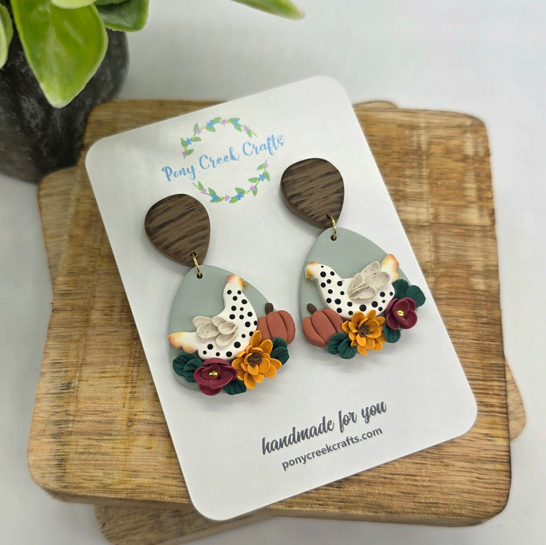 Elevate your autumn look with our Fall Hen earrings! Handmade with polymer clay and adorned with pumpkin and floral accents, these earrings are the perfect statement piece for any fall outfit. Plus, the stainless steel post ensures a comfortable and secure fit. Fall in love with our stylish and unique faux wood findings today!