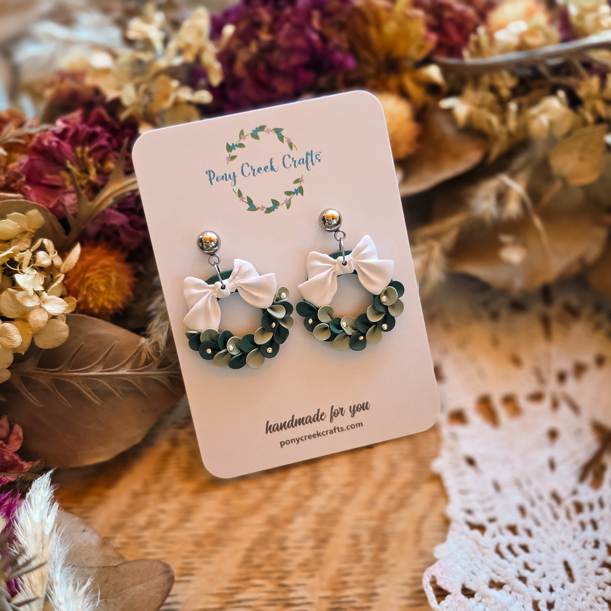 Make a statement with these enchanting polymer clay earrings inspired by winter's natural beauty. Featuring rich green hues complemented by crisp white accents and gleaming silver ball details, they bring festive sophistication to any outfit. The secure 14k gold plated ball posts provide comfort for all-day wear while adding a luxurious touch. Handcrafted with meticulous attention to detail, these earrings are the perfect way to express your seasonal style and add a pop of holiday charm to your jewelry collection.