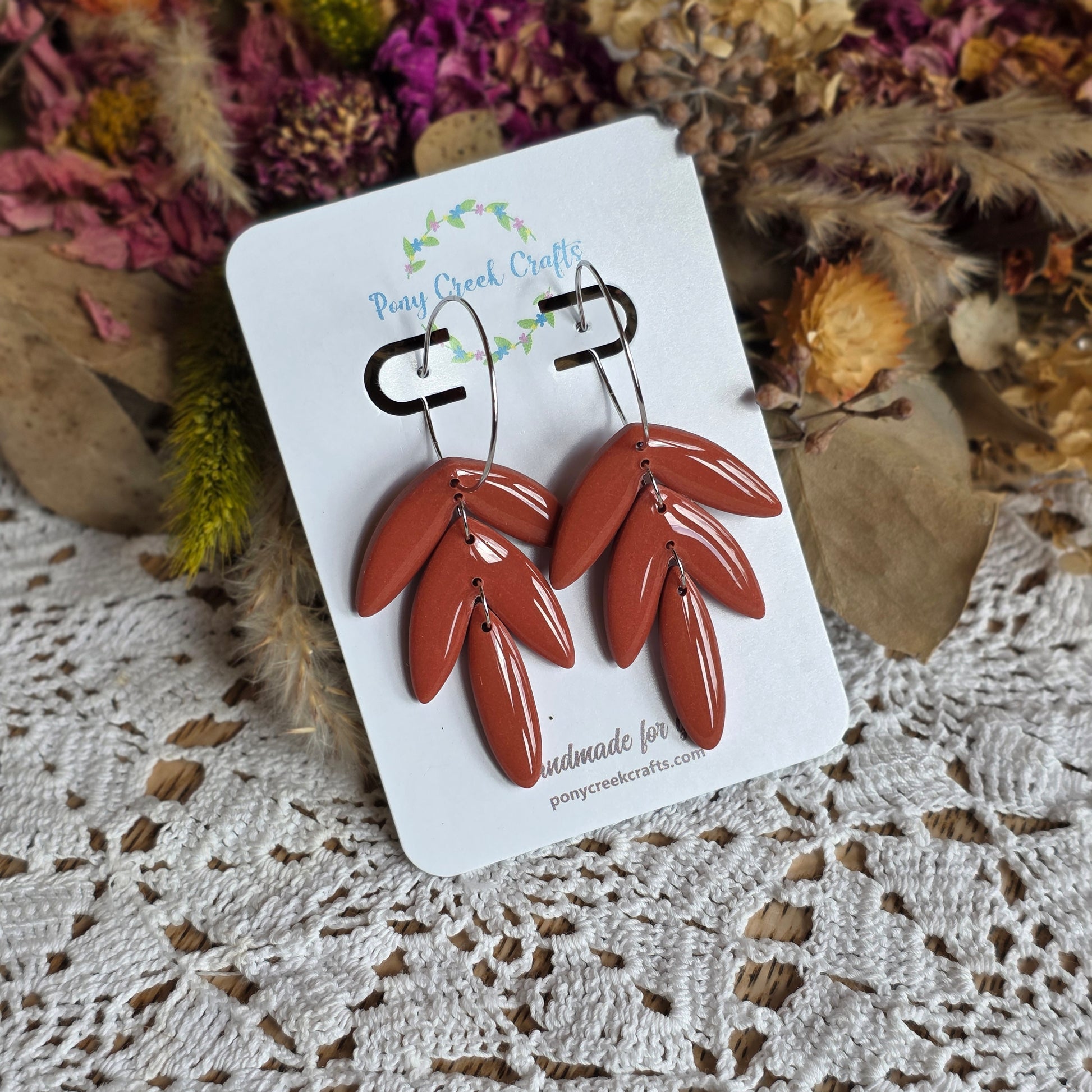 Make a bold impression with this burnt orange three-tier statement piece, crafted from lightweight polymer clay and highlighted with eye-catching resin accents. The gold-filled hoops add a touch of elegance and durability, ensuring comfort and lasting shine. Ideal for adding a vibrant, artistic flair to your wardrobe, this accessory effortlessly complements both casual and dressy looks.