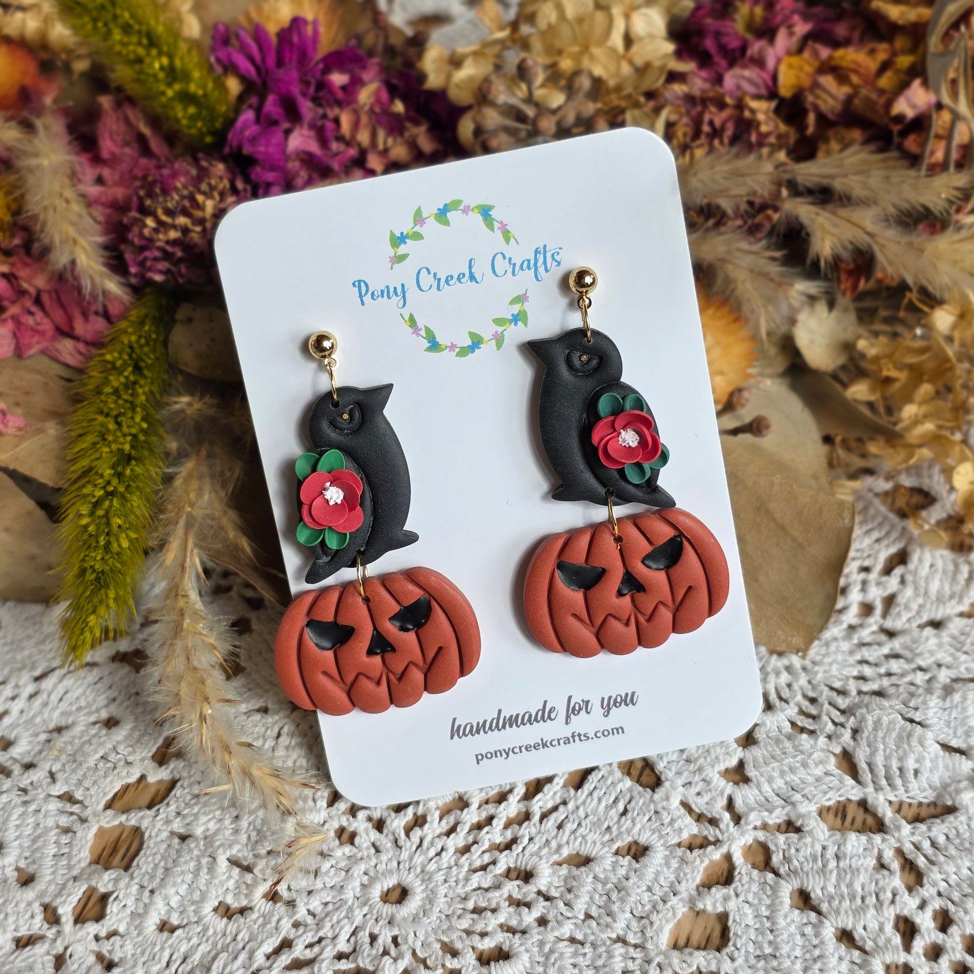 Celebrate the season with these Crow and Jack-O-Lantern earrings, featuring delicate floral accents crafted from vibrant polymer clay. Each pair is finished with gold-plated stainless steel posts, ensuring they are gentle on your skin while adding a touch of elegant shine. Perfect for fall festivals or everyday wear, these lightweight earrings combine festive charm with durable quality to elevate your autumn style effortlessly.