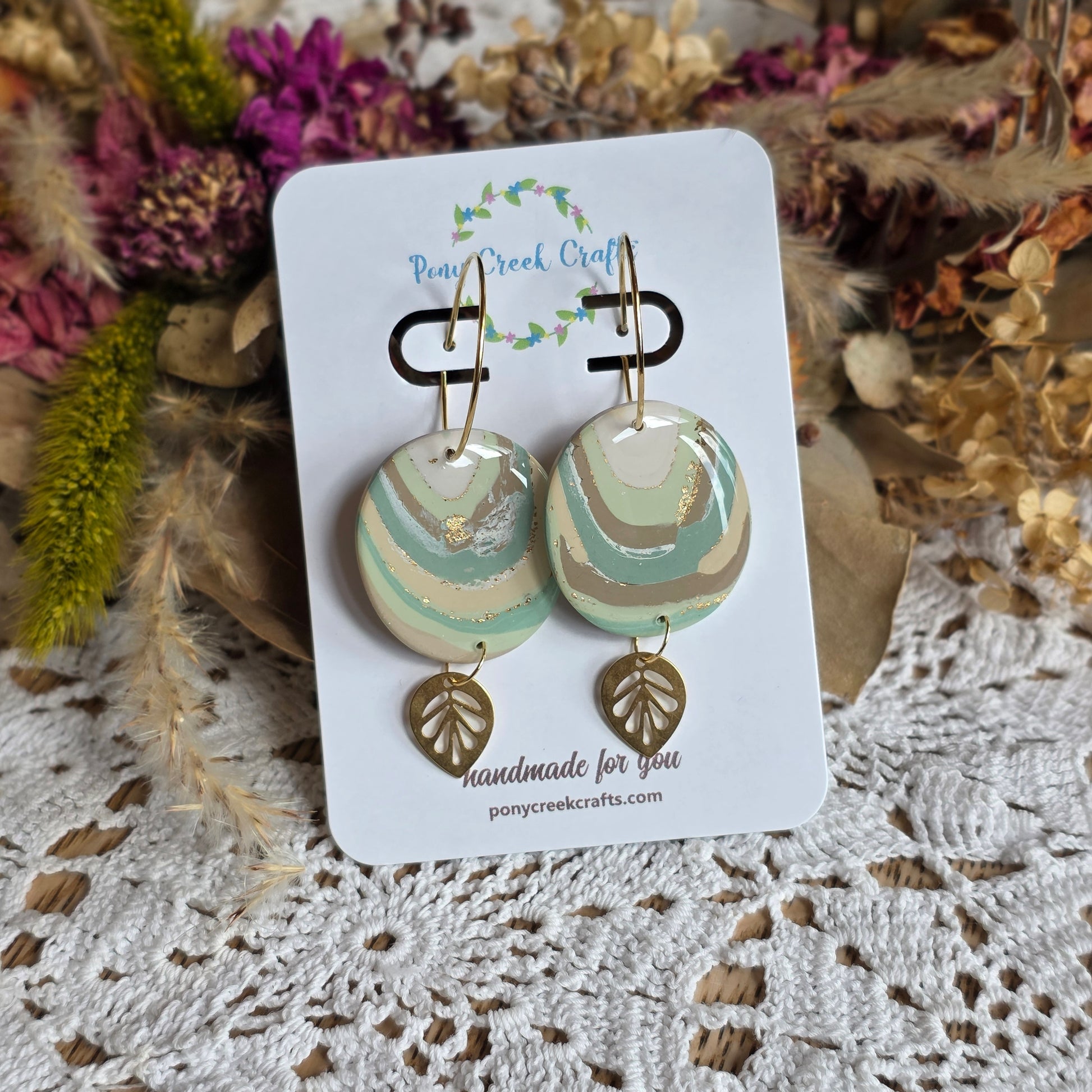 Make a bold impression with this Faux Agate statement piece, beautifully crafted from polymer clay and enhanced with a subtle resin accent. The elegant brass leaf adds a touch of nature-inspired charm, while the gold-filled hoops ensure lasting quality and shine. Perfect for elevating any look, this eye-catching accessory combines artistry and sophistication to highlight your unique style.