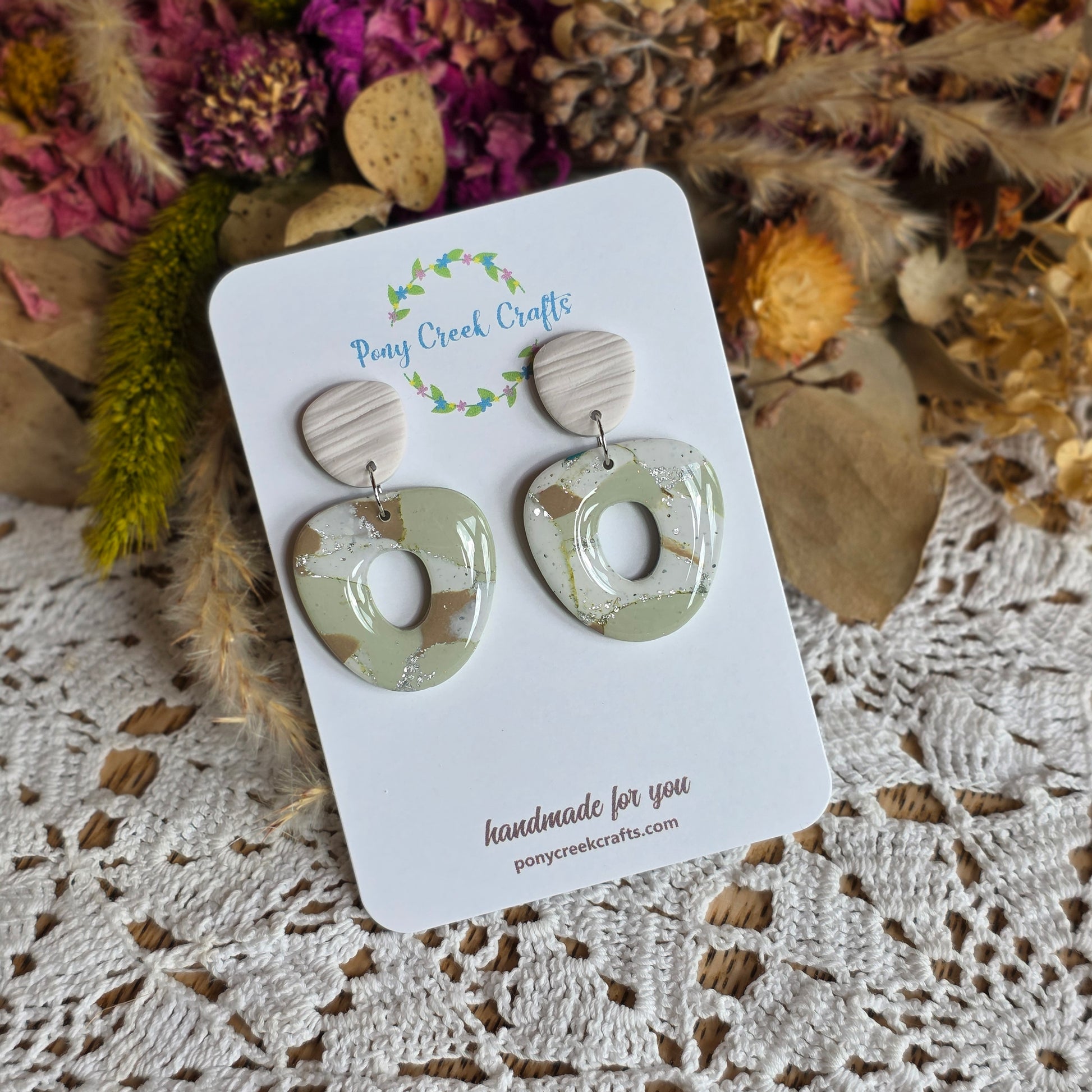 Crafted with a blend of earthy toned polymer clay and subtle resin accents, these earrings showcase a natural, off-white faux wood design set on durable stainless steel posts. Perfect for adding a warm, organic touch to any outfit while ensuring comfort and longevity.